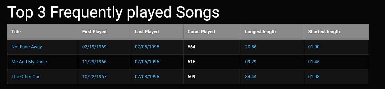 I hypothesized that perhaps YouTube could be a good source of truth for finding the best Grateful Dead song, thinking it might show which live performance is revisited the most. I thought this might be the perfect combo of modern day streaming while maintaining the importance of live performances of the band.