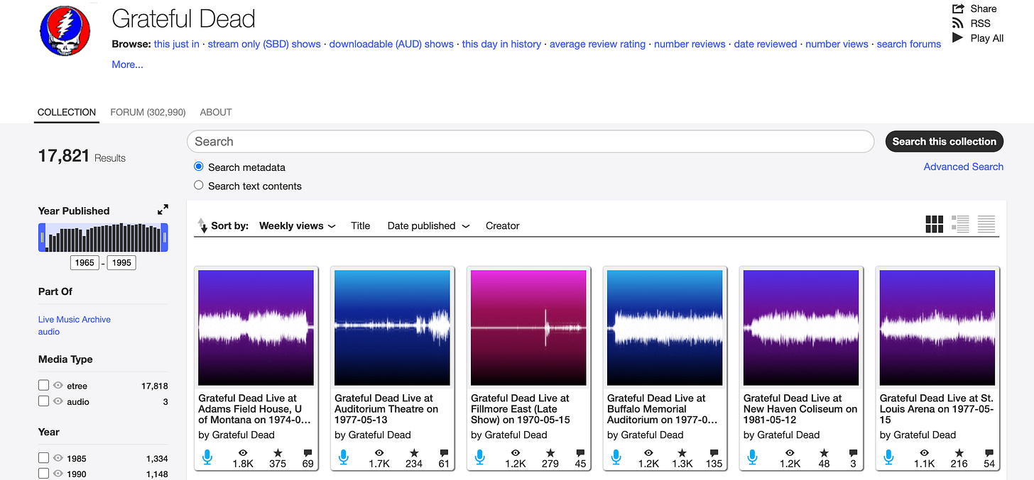 One of my favorite things about the Grateful Dead is that the band’s fans have collectively archived essentially the band’s entire history through live recordings. On Archive.org, you can find a recording of pretty much any Grateful Dead performance you can think of.