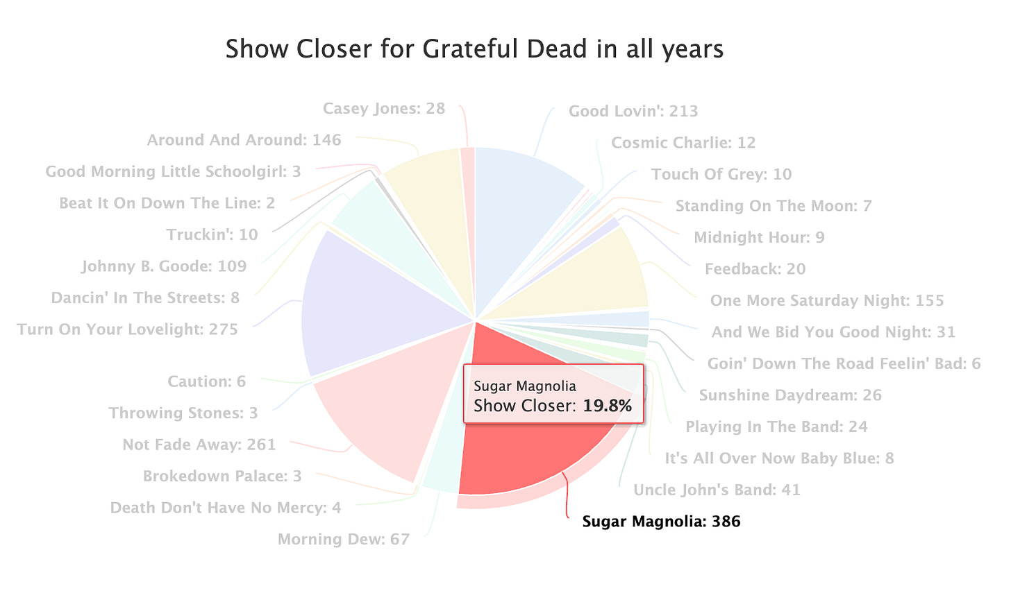 The song most often used to close shows was by far Sugar Magnolia, with 386 being played in the show closing position.